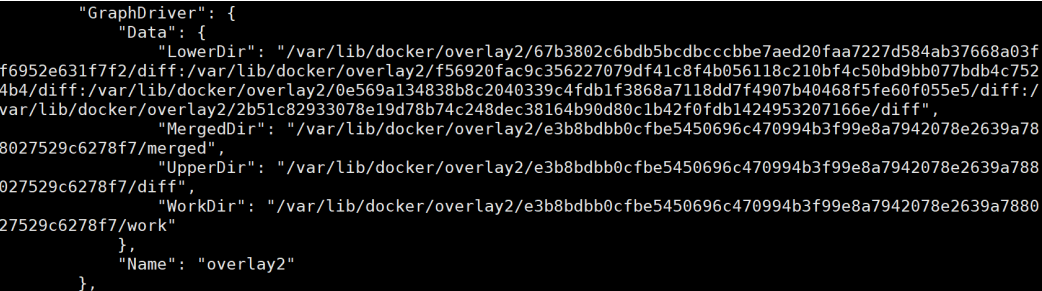 "LowerDir": "/var/lib/docker/overlay2/41e4fa41a2ad1dca9616d4c8254a04c4d9d6a3d462 c862f1e9a0562de2384dbcinit/diff:/var/lib/docker/overlay2/e3b8bdbb0cfbe5450696c470994b3f99e 8a7942078e2639a788027529c6278f7/diff:/var/lib/docker/overlay2/67b380 2c6bdb5bcdbcccbbe7aed20faa7227d584ab37668a03ff6952e631f7f2/diff:/var /lib/docker/overlay2/f56920fac9c356227079df41c8f4b056118c210bf4c50bd 9bb077bdb4c7524b4/diff:/var/lib/docker/overlay2/0e569a134838b8c20403 39c4fdb1f3868a7118dd7f4907b40468f5fe60f055e5/diff:/var/lib/docker/ov erlay2/2b51c82933078e19d78b74c248dec38164b90d80c1b42f0fdb14249532071 66e/diff", "MergedDir": "/var/lib/docker/overlay2/41e4fa41a2ad1dca9616d4c8254a04c4d9d6a3d462 c862f1e9a0562de2384dbc/merged", "UpperDir": (镜像的上层可以感知变 化)"/var/lib/docker/overlay2/41e4fa41a2ad1dca9616d4c8254a04c4d9d6a3d 462c862f1e9a0562de2384dbc/diff",【容器的修改后的文件,保存再宿主机哪里呀。 容器删除后,那些容器目录还存在吗?一定不再】 "WorkDir": "/var/lib/docker/overlay2/41e4fa41a2ad1dca9616d4c8254a04c4d9d6a3d462 c862f1e9a0562de2384dbc/work"